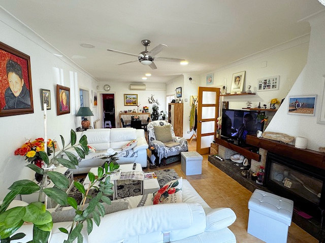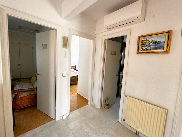 The ground floor features a spacious living/dining area with fireplace insert and air conditioning, a well-equipped kitchen, a bedroom with built-in wardrobe, and a shower room. A staircase leads to the upper floor, which houses four additional bedrooms – all with built-in wardrobes, two with access to a balcony – and another shower room. A hallway air conditioner ensures comfortable temperatures year-round.