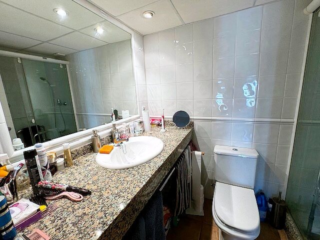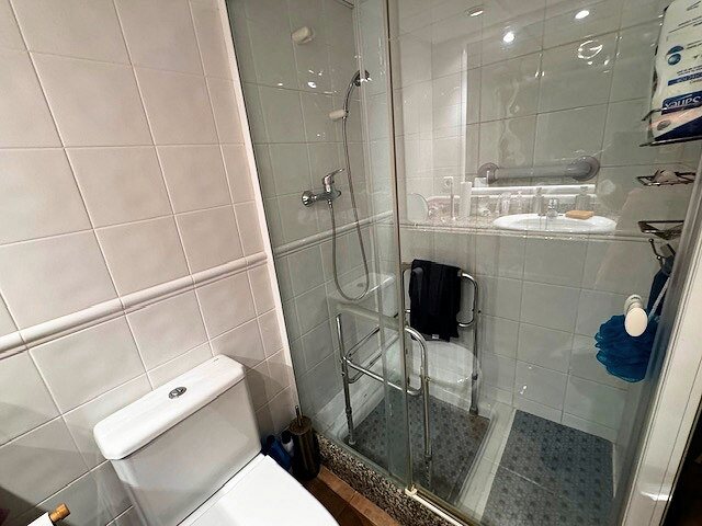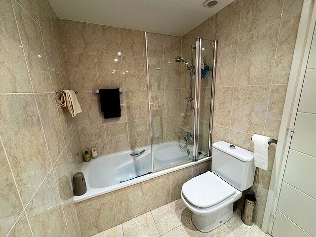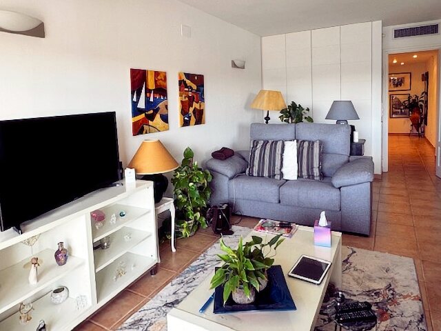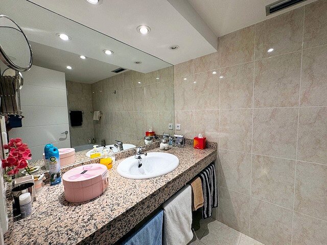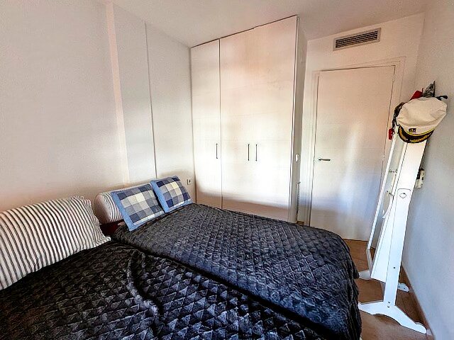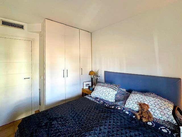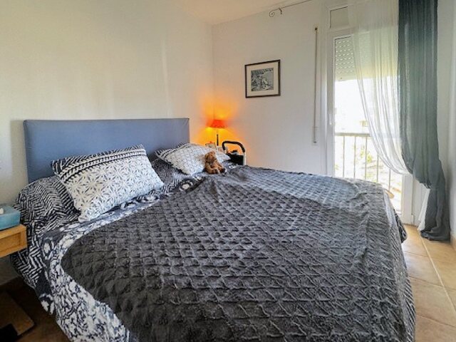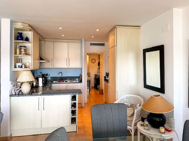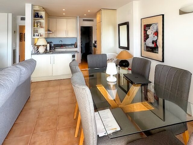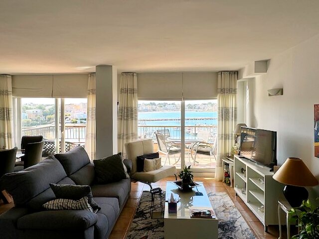 The modern living and dining area with an open kitchen leads onto a large terrace offering a stunning view over the harbor and Riells Bay. The apartment has two spacious double bedrooms with built-in wardrobes, a bathroom with a bathtub, and another with a walk-in shower. Double-glazed windows, electric sun blinds, and reversible air conditioning ensure the highest living comfort.