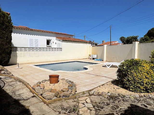 Esta casa situada en parcela de 401m2, a sólo 1200 metros de la playa y tiendas, ofrece una superficie de 95m2 con una piscina privada y terrasses con barbacoa.