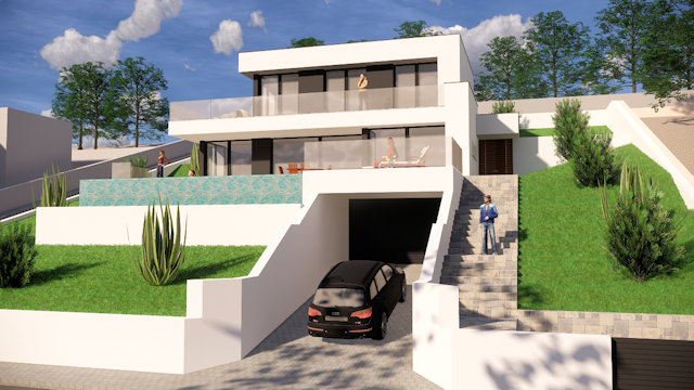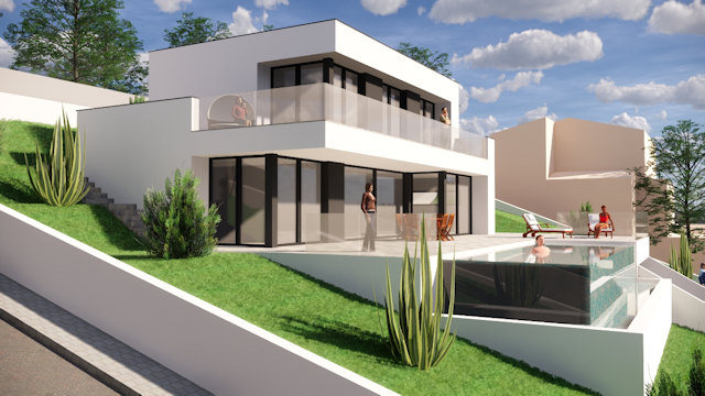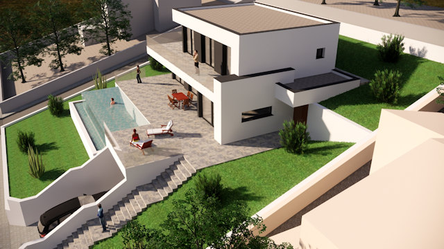 Ein Projektvorschlag mit einem 60 m² großen Wohn-Esszimmer, vier Schlafzimmern mit jeweils eigenem Bad, 60 m² Terrassen, einem Schwimmbad und einer 95 m² großen Garage liegt vor und kann als Grundlage für die Planung genutzt werden.