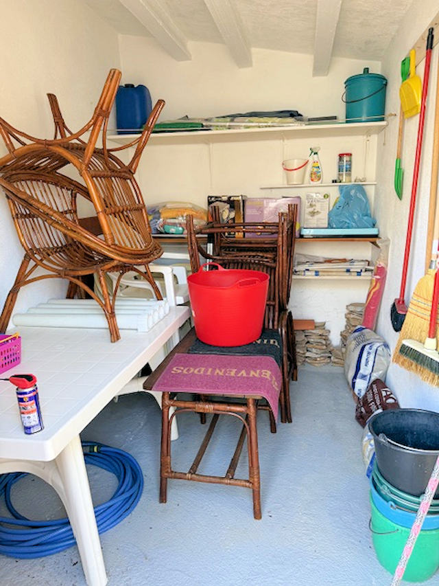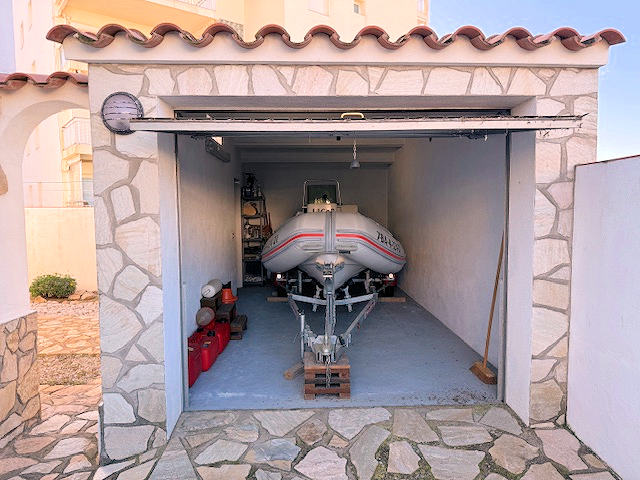 Zum Haus gehören eine große Garage ein Abstellraum und ein Parkplatz.